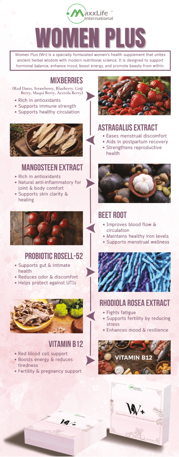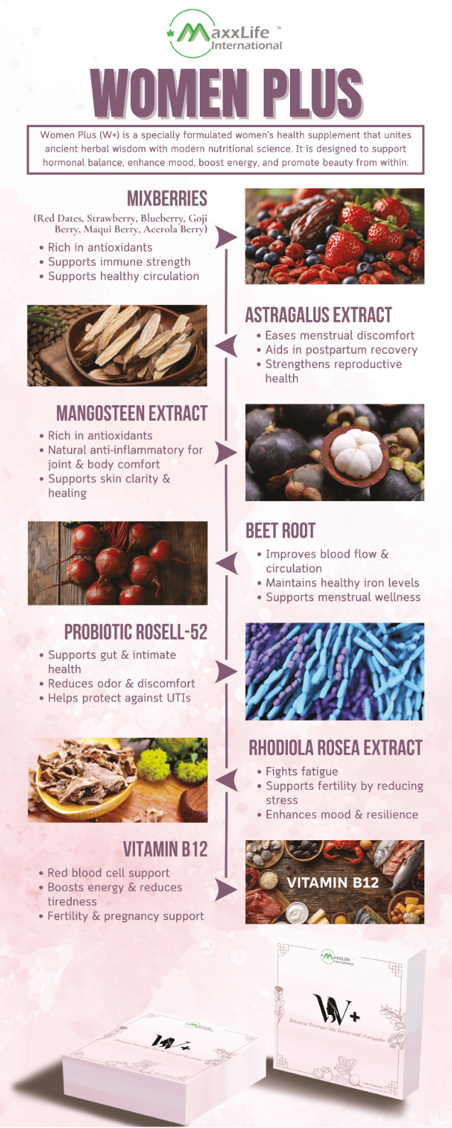 Women Plus (W+) is a specially formulated women's health supplement that unites ancient herbal wisdom with modern nutritional science. It is designed to support hormonal balance, enhance mood, boost energy, and promote beauty from within.